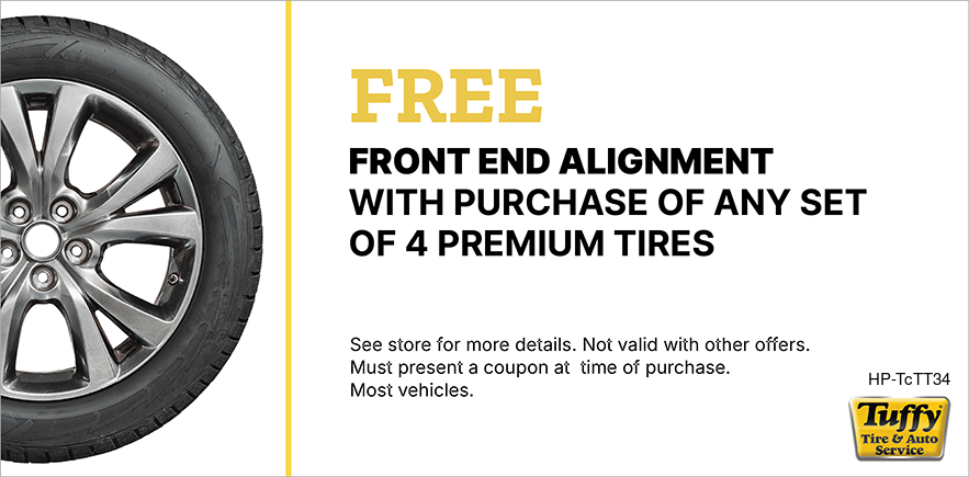 Good only atTuffy Gallatin Expires 04/15/26 Schedule Service Print coupon Share to Google Share to Facebook Offer details Free Front End Alignement w/ Tire Purchase of 4 Premium Tires * See coupon for exclusions. Email Coupon First name * Last name * Email address * Sign me up to receive future offers via text from Tuffy Gallatin: Via Text Cell/Mobile Phone By clicking "I accept" below, I expressly agree to receive marketing text messages made by or on behalf of Tuffy Gallatin to the telephone number(s) I’ve listed above. I understand that I may receive such text messages by the use of Automatic Telephone Dialing Systems (including “Predictive Dialers” or “Autodialers”) and I agree to receive them even if I have registered my number(s) with my state or federal Do-Not-Call list(s). I understand that such text messages will include advertising containing offers for goods or services and that I may revoke this consent at any time by telephone, return text message or by Visiting tuffygallatin.com/stop to unsubscribe. Message and data rates may apply. I also understand that I am NOT required to provide this consent as a condition of purchasing goods or services. I accept View: Text Specials Terms and Conditions with this link.